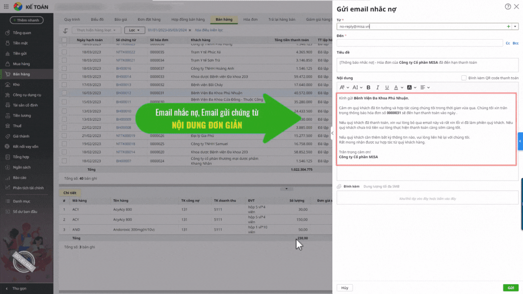 Tự động nhắc nhở khi đến hạn thu nợ - trả nợ. Cho phép gửi mail nhắc nợ ngay trên phần mềm giúp DN tránh bị chiếm dụng vốn